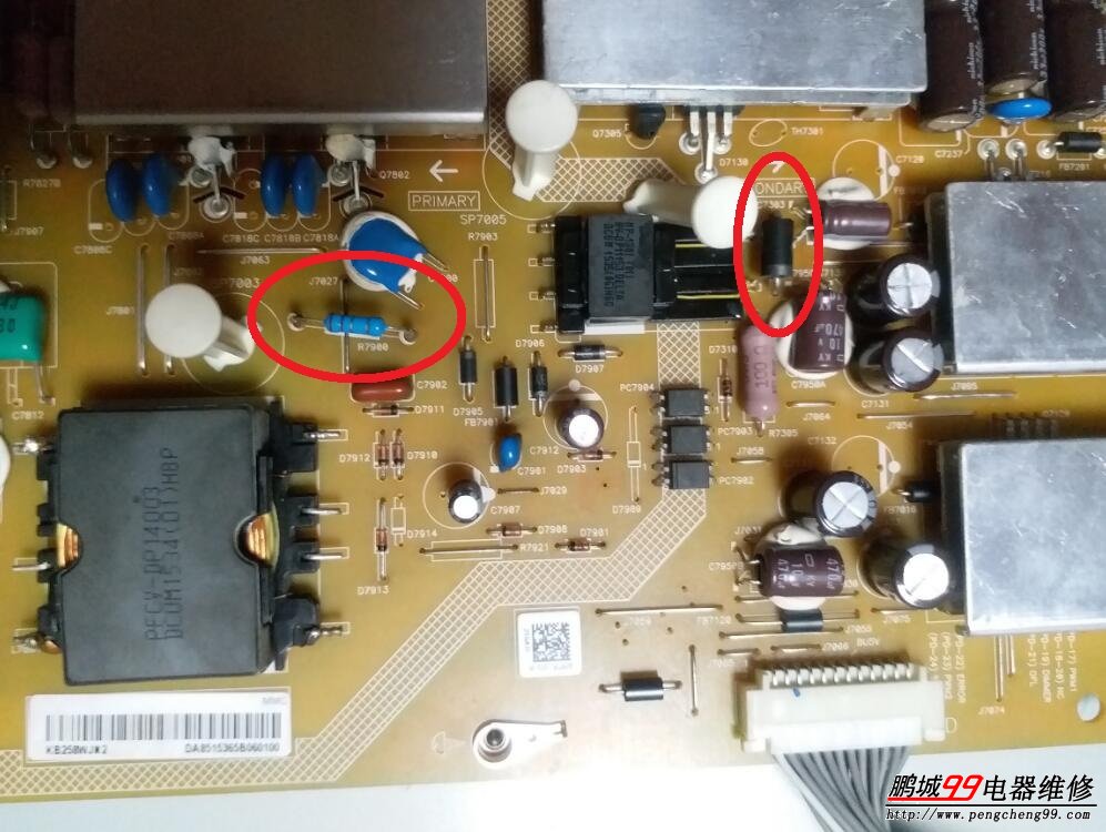 給電源板單板通電測量,大電容兩端300V電壓正常,順著電路往5V開關(guān)變壓器處測量,沒了300V輸入了。斷電后給大電容放完電后再測量,大電容的正極300V到5V開關(guān)變壓器初級引腳的電路不通了,再順路測量,位號R7900/2.2歐姆的限流電阻已經(jīng)開路了,再順路測量到位號IC7903/型號DAP021的5V電源芯片擊穿短路了。第一次見這個型號的電源芯片,手里頭也沒貨,只好跟用戶講拆板帶回去修了。