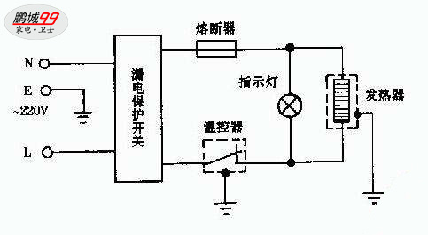 電熱水器的加熱通過(guò)電熱管來(lái)進(jìn)行,溫度的設(shè)定則通過(guò)調(diào)節(jié)溫控器進(jìn)行,電熱水器將電能轉(zhuǎn)換成熱能,傳給被加熱的媒體(水),水達(dá)到預(yù)定溫度時(shí),溫控器會(huì)自動(dòng)斷電,停止加熱。一段時(shí)間后,當(dāng)水溫比設(shè)定溫度下降5℃左右時(shí),溫控器會(huì)重新工作,繼續(xù)恢復(fù)加熱至設(shè)定溫度,如此反復(fù)工作。電氣原理圖見(jiàn)圖。