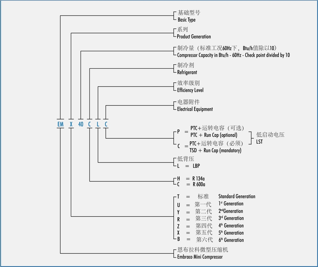 恩布拉科壓縮機(jī)型號(hào)命名規(guī)則方法: