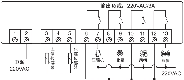 ◇制冷、化霜、風(fēng)機、報警輸出觸點容量:3A/220VAC