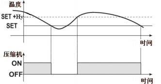 Hy 溫差值: (0.1℃ ~ 25.5℃) 設(shè)定一個相對于設(shè)定點(diǎn)的溫差, 當(dāng)測量溫度大于等于 SET+Hy 時,壓縮機(jī)投入運(yùn)行,當(dāng)溫度小于等于 SET 時,壓縮機(jī)停止運(yùn)行