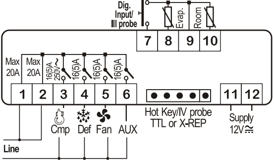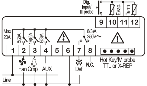 Lod 默認(rèn)的面板顯示選擇: (P1、P2、P3、P4、SET、dtr) P1= 庫溫探頭; P2= 蒸發(fā)器 探頭; P3=第三探頭(只有帶有第三探頭選項的型號才可用); P4= 第四探頭; SET =設(shè)定點(diǎn); dtr=顯示按照參數(shù) dtr 的設(shè)定的探頭所占百分?jǐn)?shù)的讀數(shù)。
