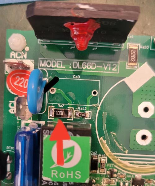 又想到昨天測量的繼電器沒有吸合,既然繼電器沒有吸合,我就直接短接繼電器試一下看會有什么效果。短接了繼電器后再次通電,大電容上有300多伏直流電壓了,而且E06故障代碼消失了,但是另外顯示了E04的故障代碼。大電容上有了300V電壓、E06故障碼消失了,從這兩點說明E06可能真是代表電壓異常的故障代碼,重點就要查找電壓取樣電路了。拆下礙事的大電容,電容下面果然有兩條小線路通過兩個貼片電阻連接了大電容正負(fù)極兩端,這顯然就是電壓取樣電路了。但是取樣的是大電容兩端的電壓,繼電器不吸合的情況下大電容兩端是無電壓的,這樣是無法取樣的,那么可能還會通過另外的線路能夠取樣呢!分析了220V交流到大電容之間不僅通過一個繼電器和整流橋,還可以通過另外一個黃色的安規(guī)電容和貼片電阻來使大電容獲得電壓,用萬用表測量了這個100Ω的貼片電阻,發(fā)現(xiàn)開路了。立刻找了一個100歐姆的色環(huán)電阻并聯(lián)上去,再次通電,有繼電器吸合的聲音了,E06故障代消失,還是顯示E04故障碼。但是這倒是不擔(dān)心,因為馬達(dá)還沒有接上去嘛。